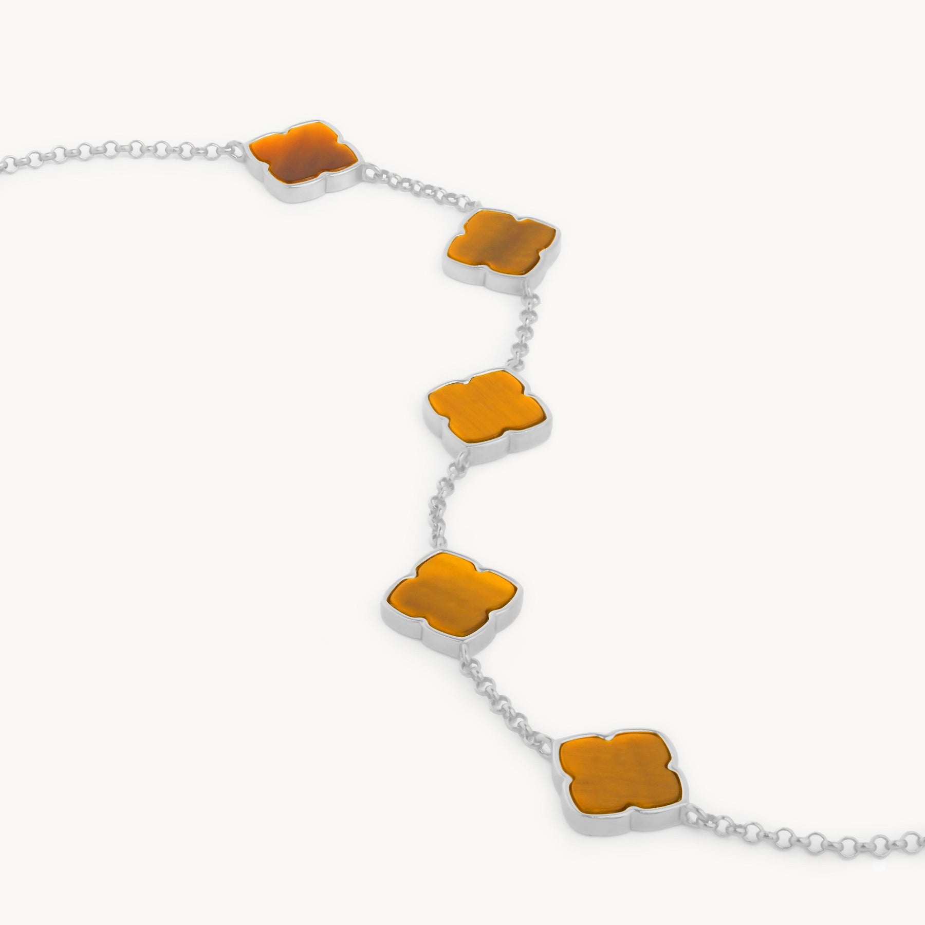 Schätze des Ozeans, zeitlose Eleganz. Ornamentale Tigerauge-Steine, auf einer zarten Kette aufgereiht, inspiriert von der natürlichen Schönheit des Meeres. Tragen Sie sie geschichtet, um Ihren eigenen unverwechselbaren Stil zu kreieren, oder kombinieren Sie sie mit den Amaya-Ohrringen für einen kompletten Look.